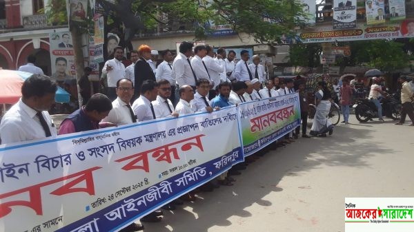 আজ বুধবার সকাল ৯ঃ৫০ মিনিটে ফরিদপুর আইনজীবী সমিতির সামনে আইন বিচার ও সংসদ বিষয়ক মন্ত্রণালয় এর প্রজ্ঞাপন বাতিল দাবিতে উক্ত মানববন্ধন অনুষ্ঠিত হয়।