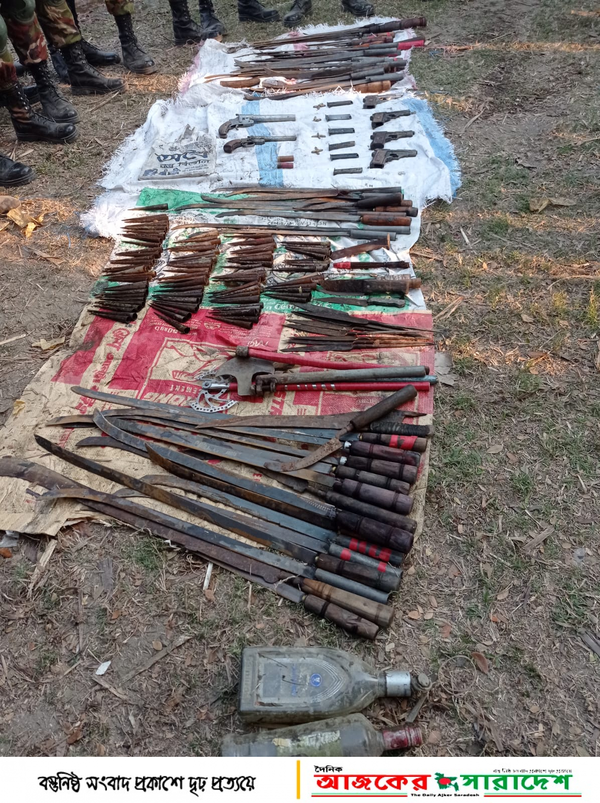 উদ্ধারকৃত অস্ত্র ও গোলাবারুদ যৌথ বাহিনীর ক্যাম্পে নেওয়া হয়েছে।