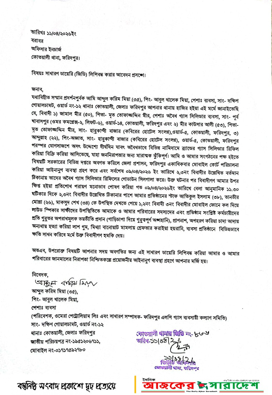 আজ শনিবার আব্দুল করিম মিয়া (৩৫) নামে এক ব্যবসায়ী কোতয়ালী থানায় এ সাধারণ ডায়েরি করেন। তিনি দক্ষিণ গোয়ালচামট এলাকার বাসিন্দা এবং ওমেরা পেট্রোলিয়াম লিমিটেডের পরিবেশক ও ফরিদপুর এলপি গ্যাস ব্যবসায়ী কল্যাণ সমিতির সাধারণ সম্পাদক।
